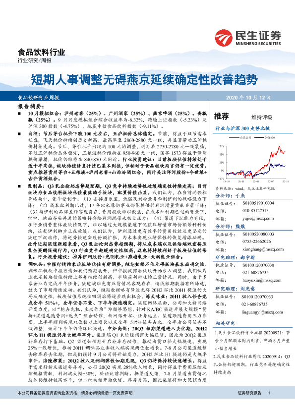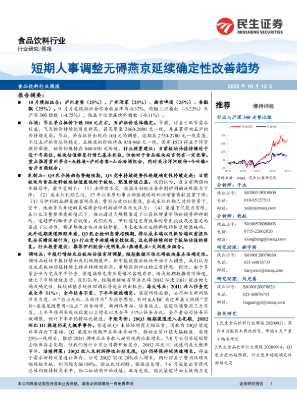 【民生证券】【20201012】20201012-民生证券-食品饮料行业周报:短期人事调整无碍燕京延续确定性改善趋势-29页