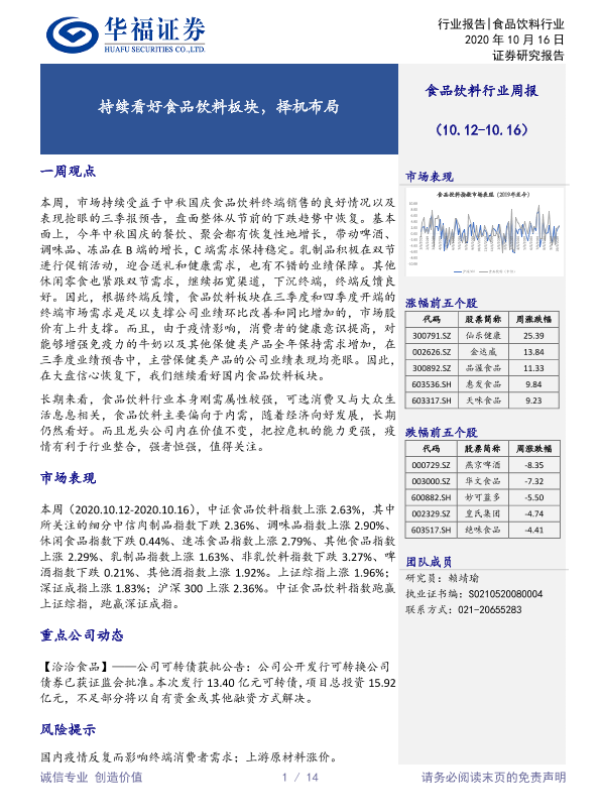 【华福证券】【20201016】20201016-华福证券-食品饮料行业周报:持续看好食品饮料板块,择机布局-14页