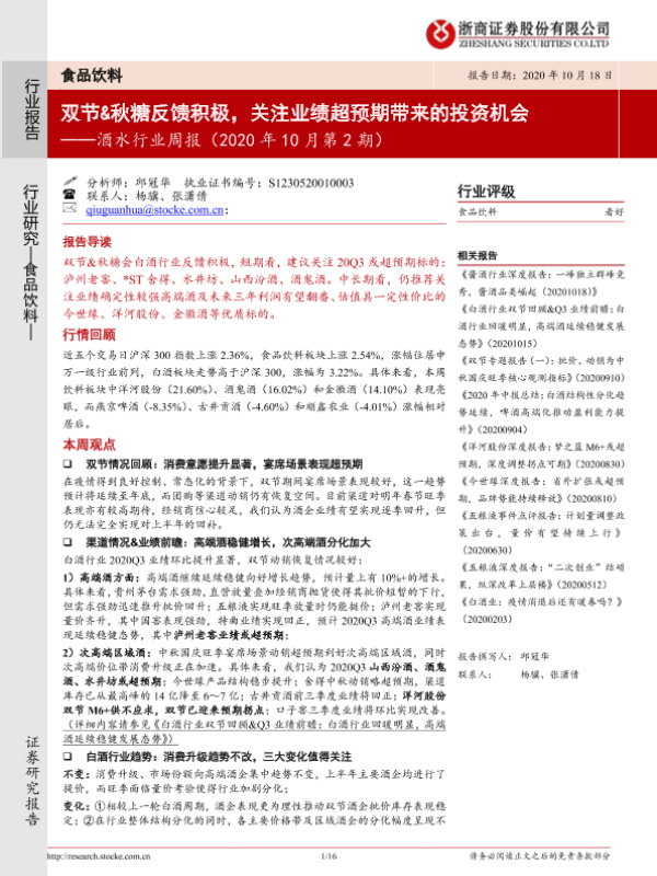 【浙商证券】【20201018】20201018-浙商证券-酒水行业周报(2020年10月第2期):双节&秋糖反馈积极,关注业绩超预期带来的投资机会-16页