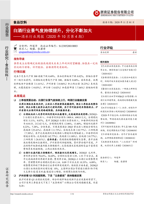 【浙商证券】【20201101】20201101-浙商证券-酒水行业周报(2020年10月第4期):白酒行业景气度持续提升,分化不断加大-16页
