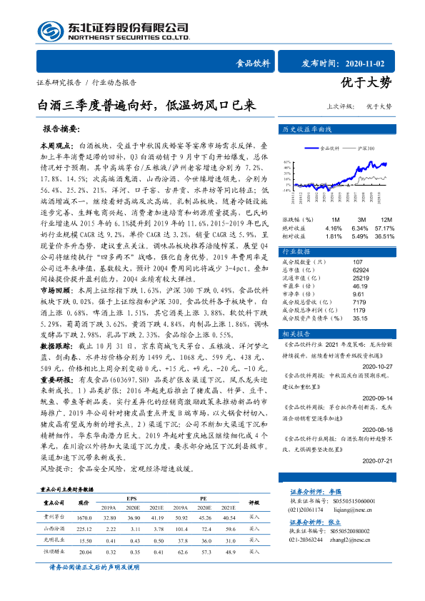 【东北证券】【20201102】20201102-东北证券-食品饮料行业动态报告:白酒三季度普遍向好,低温奶风口已来-18页
