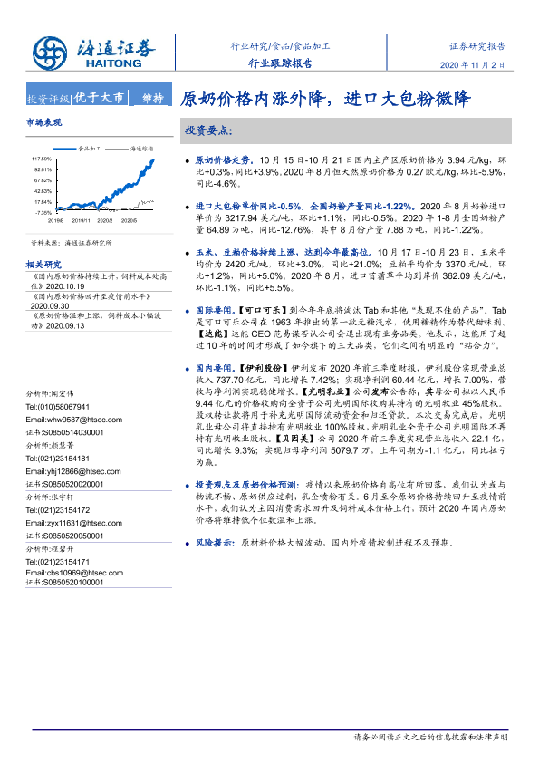 【海通证券】【20201102】食品加工行业跟踪报告:原奶价格内涨外降,进口大包粉微降-10页