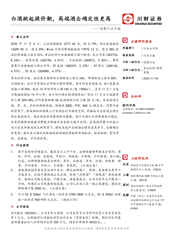 【川财证券】【20201104】消费行业日报:白酒掀起提价潮,高端酒企确定性更高-3页