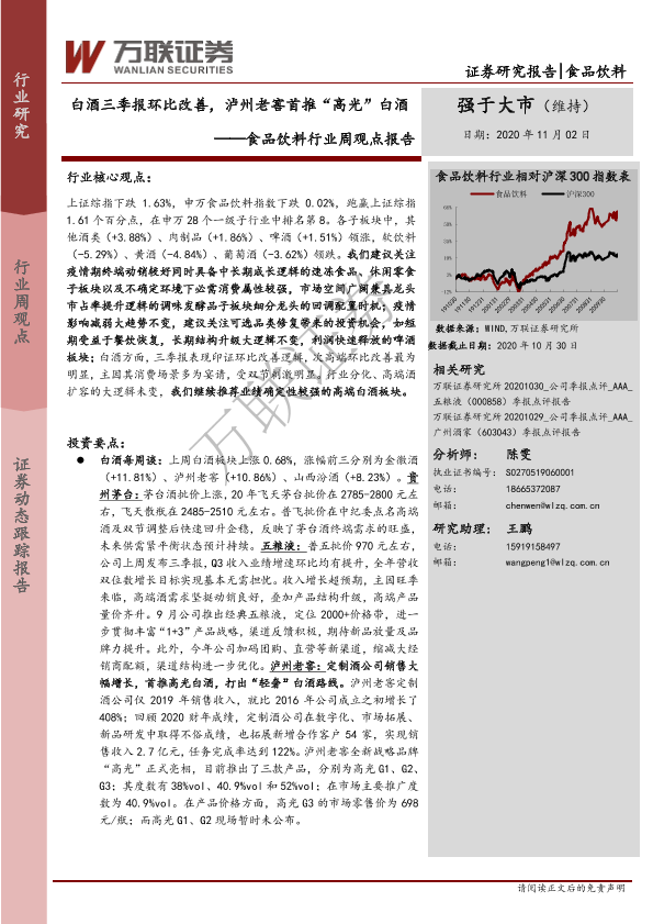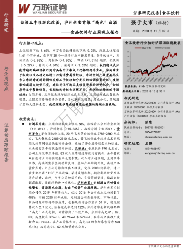 【万联证券】【20201102】20201102-万联证券-食品饮料行业周观点报告:白酒三季报环比改善,泸州老窖首推“高光”白酒-12页