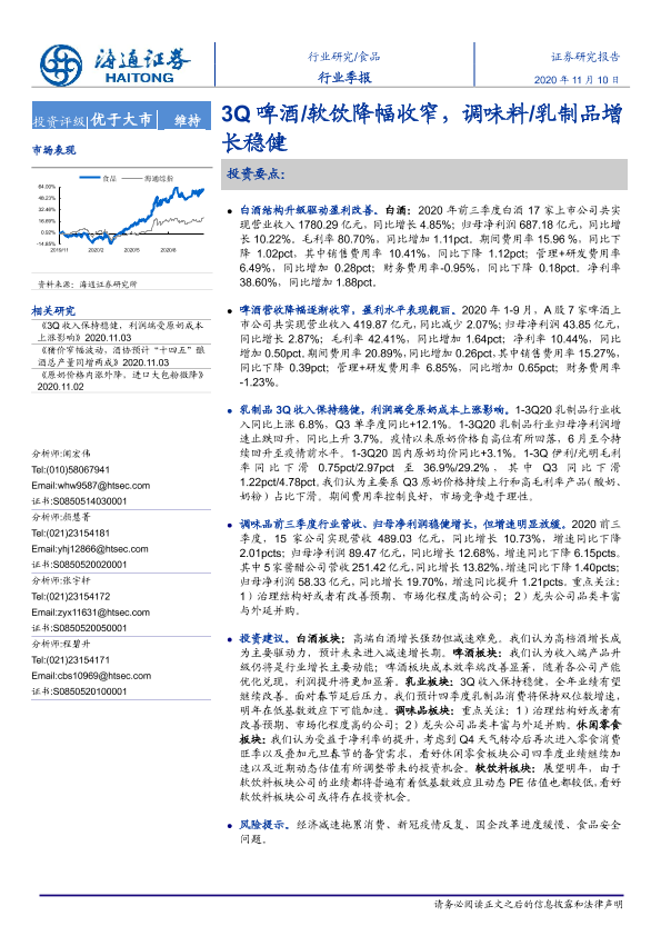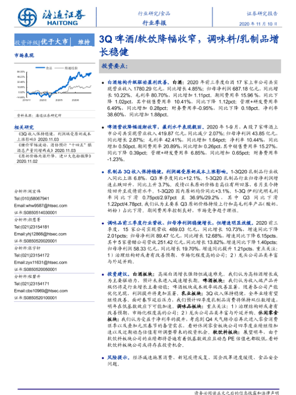 【海通证券】【20201110】20201110-海通证券-食品行业季报:3Q啤酒 软饮降幅收窄,调味料 乳制品增长稳健-16页