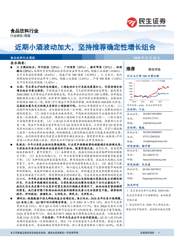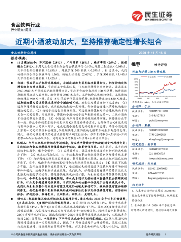 【民生证券】【20201116】20201116-民生证券-食品饮料行业周报:近期小酒波动加大,坚持推荐确定性增长组合-31页