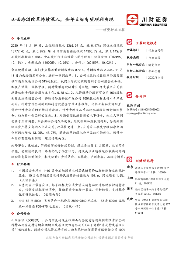 【川财证券】【20201119】消费行业日报:山西汾酒改革持续深入,全年目标有望顺利实现-3页