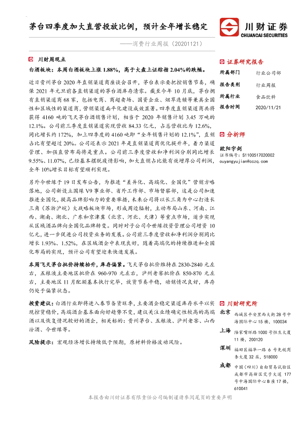 【川财证券】【20201121】20201121-川财证券-消费行业周报:茅台四季度加大直营投放比例,预计全年增长稳定-13页