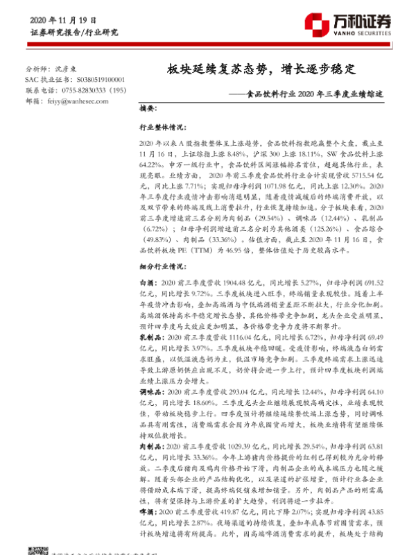 【万和证券】【20201119】食品饮料行业2020年三季度业绩综述:板块延续复苏态势,增长逐步稳定-19页