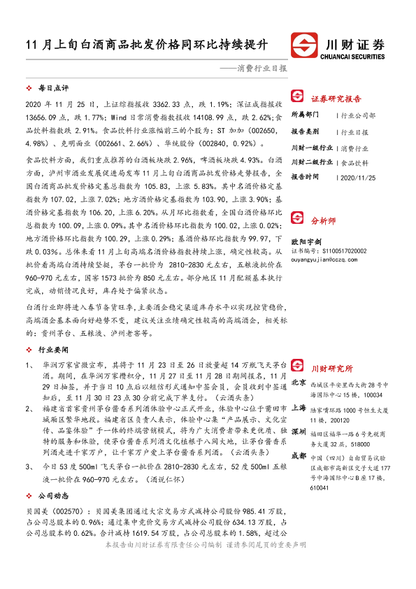 【川财证券】【20201125】消费行业日报:11月上旬白酒商品批发价格同环比持续提升-3页