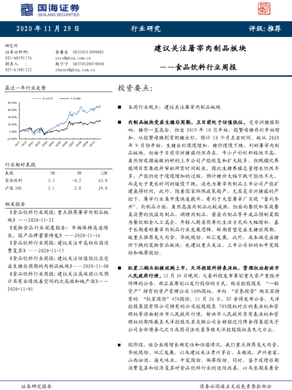 【国海证券】【20201129】20201129-国海证券-食品饮料行业周报:建议关注屠宰肉制品板块-19页