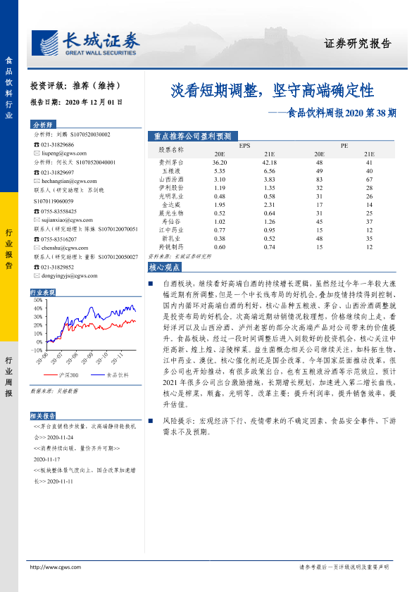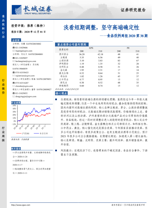 【长城证券】【20201201】食品饮料周报2020第38期:淡看短期调整,坚守高端确定性-10页