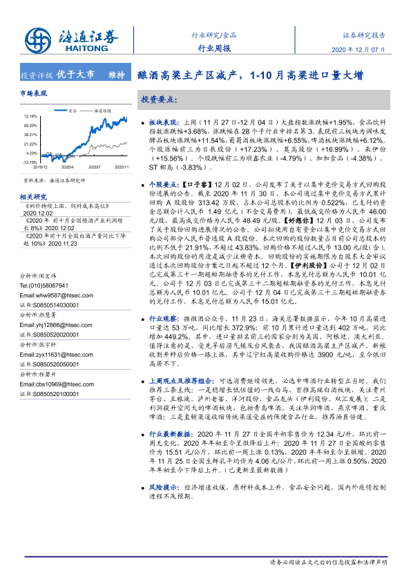 【海通证券】【20201207】20201207-海通证券-食品行业周报:酿酒高粱主产区减产,1-10月高粱进口量大增-7页