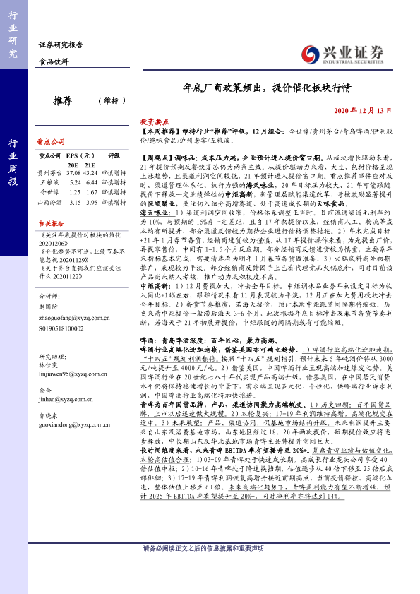 【兴业证券】【20201213】20201213-兴业证券-食品饮料行业周报:年底厂商政策频出,提价催化板块行情-16页