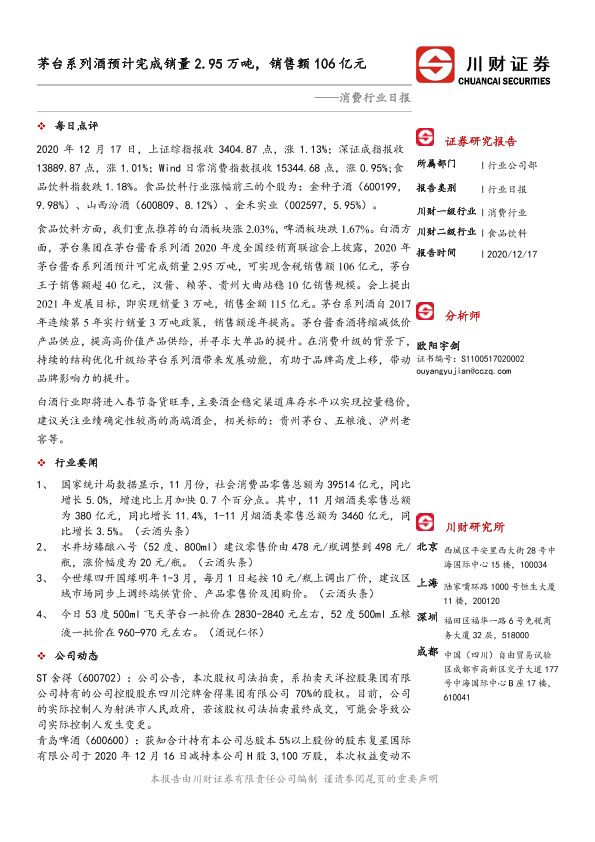 【川财证券】【20201217】消费行业日报:茅台系列酒预计完成销量2.95万吨,销售额106亿元-3页