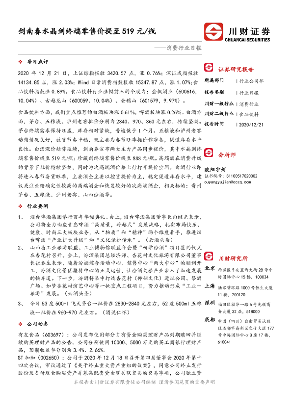 【川财证券】【20201221】消费行业日报:剑南春水晶剑终端零售价提至519元 瓶-3页