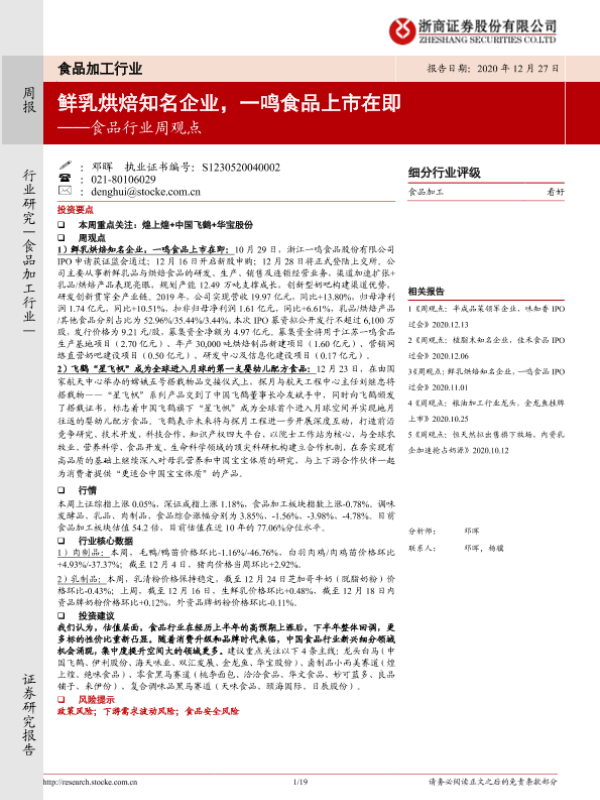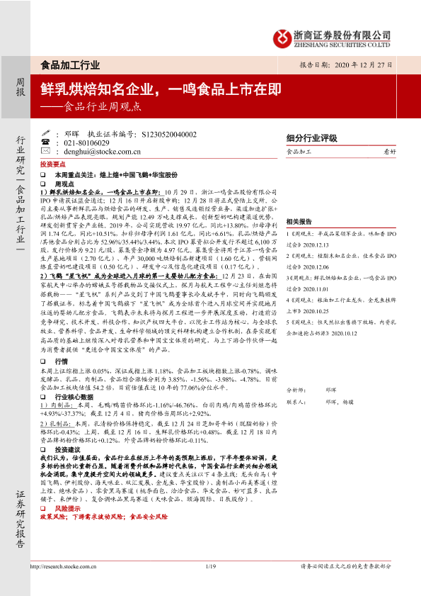 【浙商证券】【20201227】20201227-浙商证券-食品行业周观点:鲜乳烘焙知名企业,一鸣食品上市在即-19页
