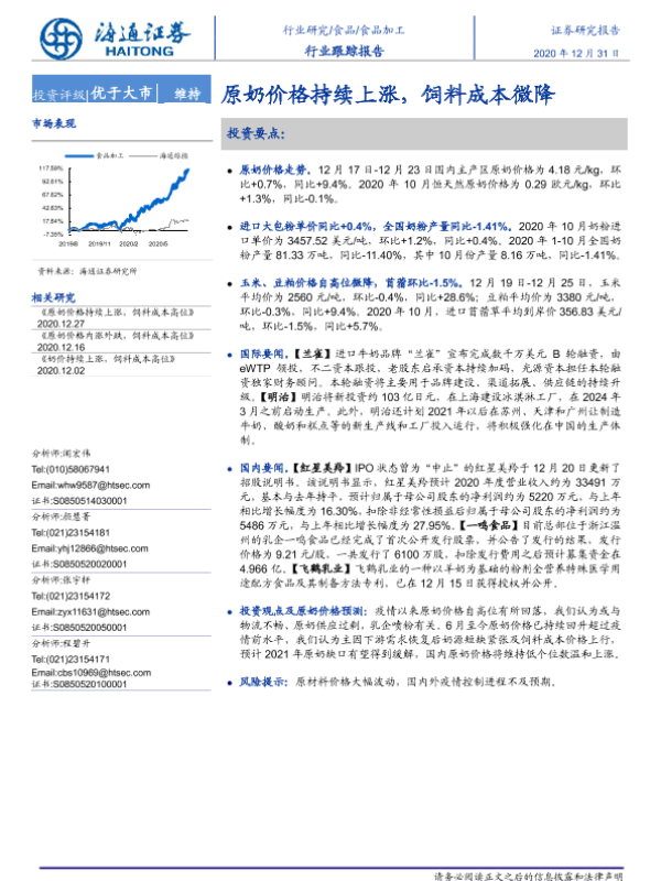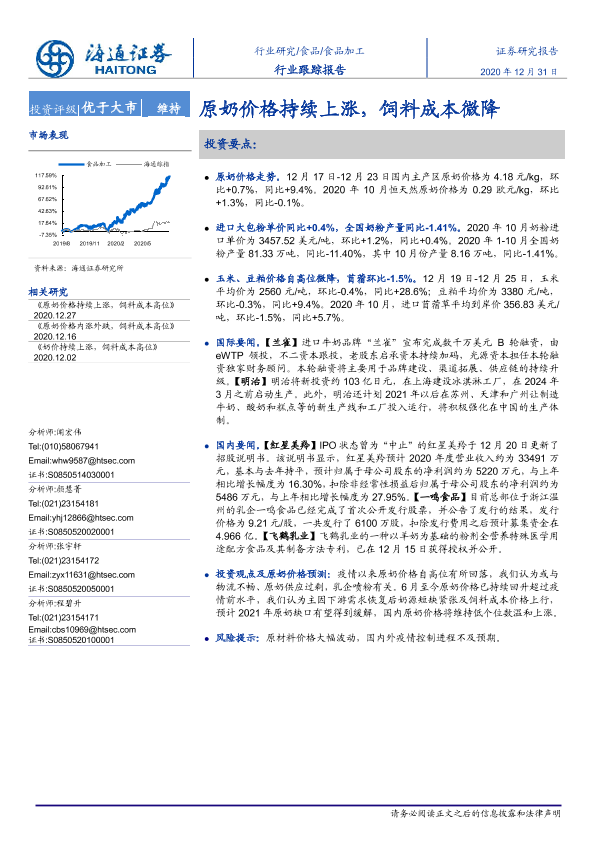 【海通证券】【20201231】食品加工行业跟踪报告:原奶价格持续上涨,饲料成本微降-10页