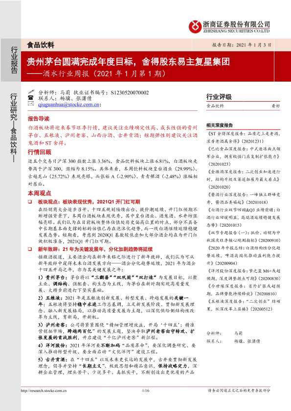 【浙商证券】【20210103】2021年1月第1期酒水行业周报:贵州茅台圆满完成年度目标,舍得股东易主复星集团-16页