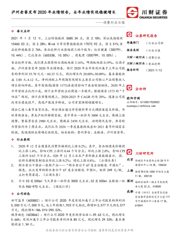 【川财证券】【20210112】消费行业日报:泸州老窖发布2020年业绩预告,全年业绩实现稳健增长-3页