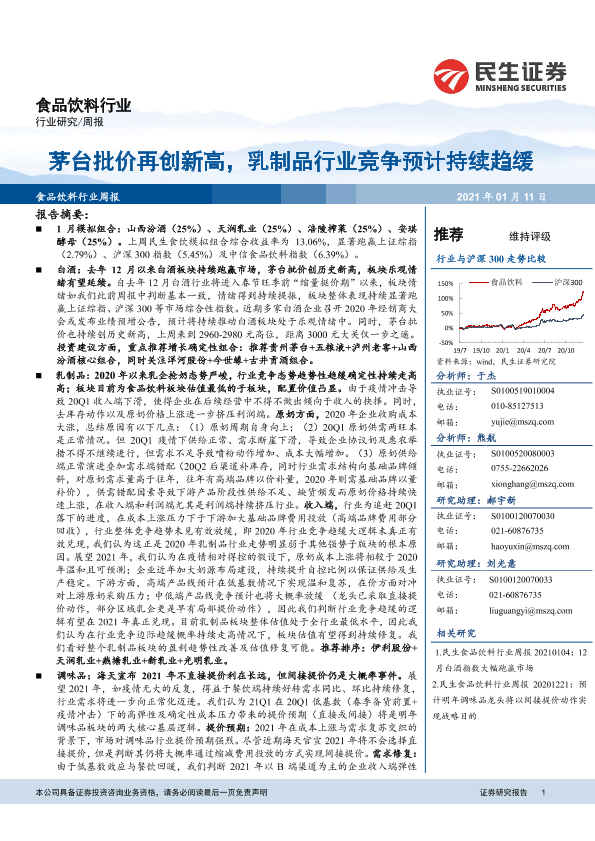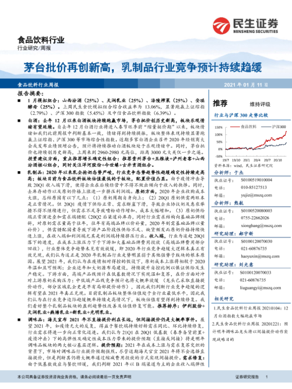 【民生证券】【20210111】20210111-民生证券-食品饮料行业周报:茅台批价再创新高,乳制品行业竞争预计持续趋缓-38页