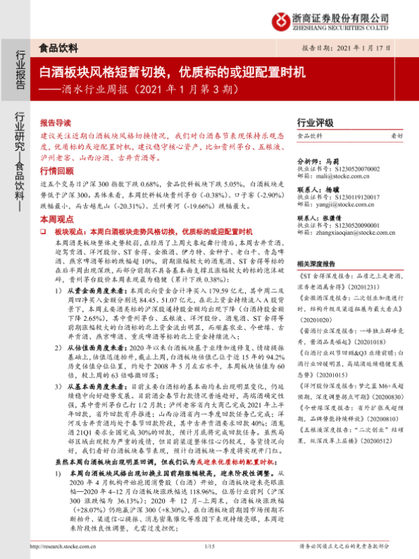 【浙商证券】【20210117】酒水行业周报(2021年1月第3期):白酒板块风格短暂切换,优质标的或迎配置时机-15页