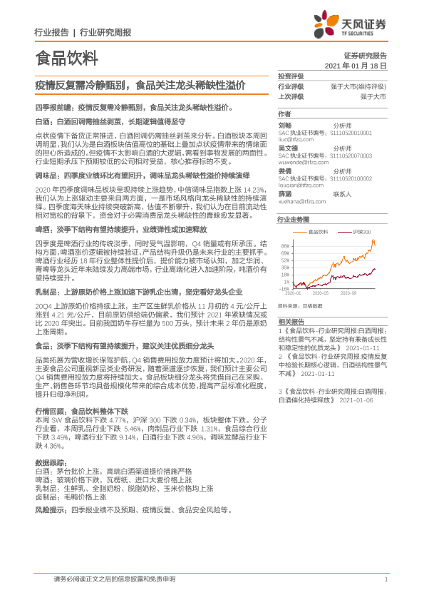 【天风证券】【20210118】20210118-天风证券-食品饮料行业研究周报:疫情反复需冷静甄别,食品关注龙头稀缺性溢价-12页