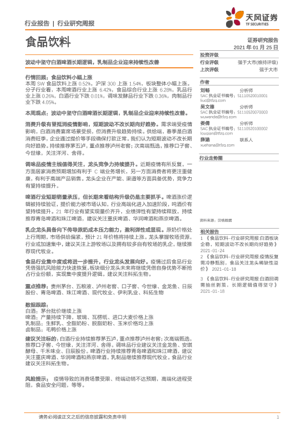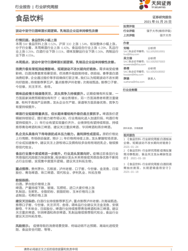 【天风证券】【20210125】食品饮料行业:波动中坚守白酒啤酒长期逻辑,乳制品企业迎来持续性改善-9页