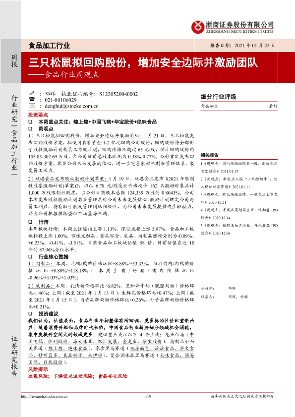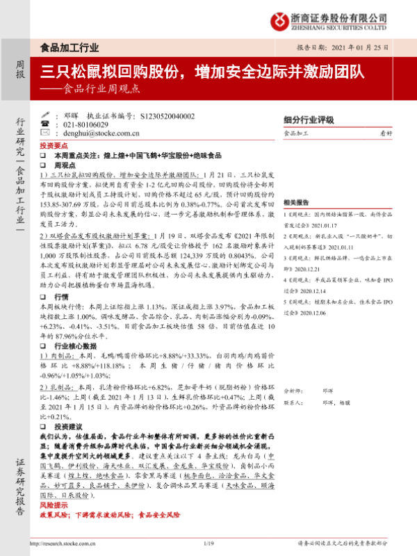 【浙商证券】【20210125】20210125-浙商证券-食品行业周观点:三只松鼠拟回购股份,增加安全边际并激励团队-19页