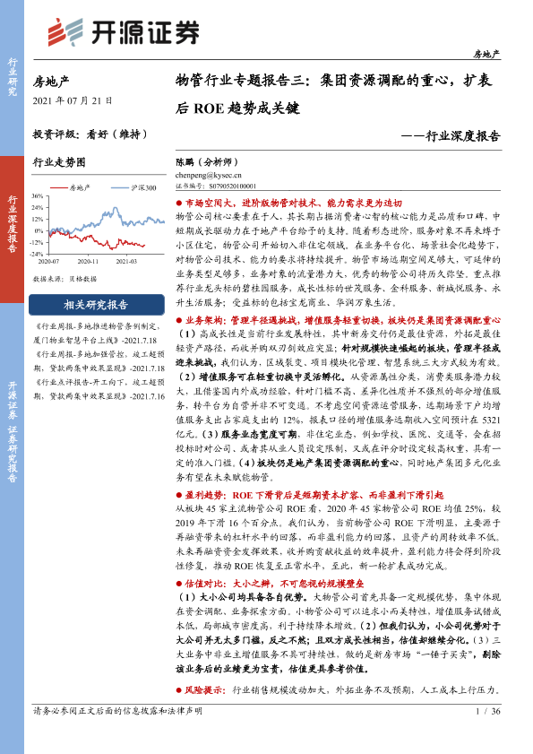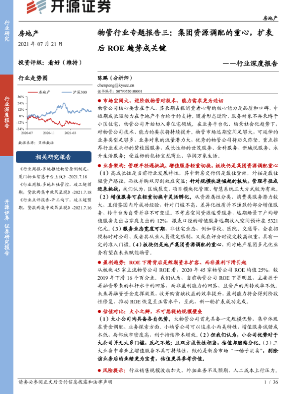【开源证券】【20210721】房地产行业深度报告:物管行业专题报告三,集团资源调配的重心,扩表后ROE趋势成关键-36页