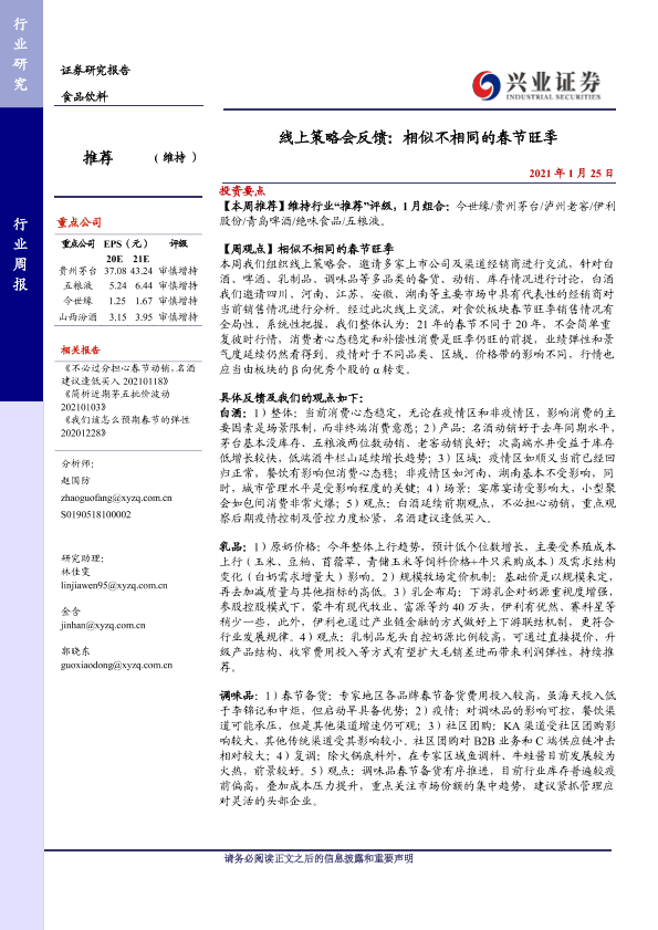 【兴业证券】【20210125】20210125-兴业证券-食品饮料行业周报:线上策略会反馈:相似不相同的春节旺季-13页