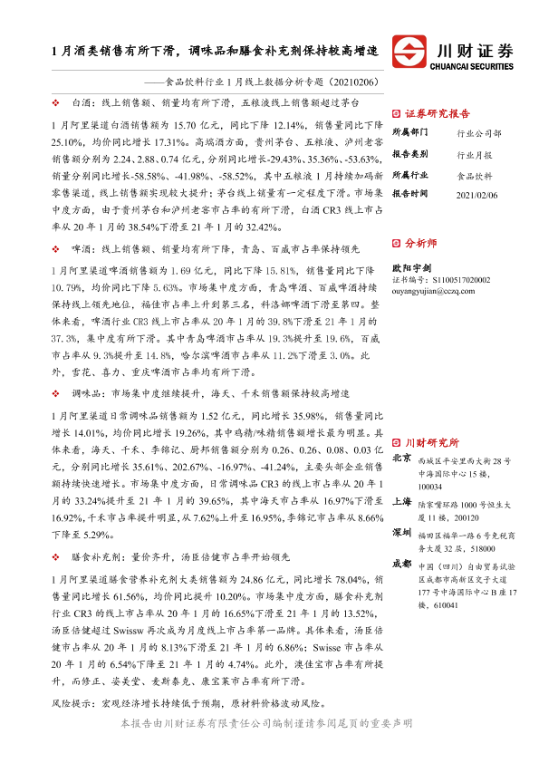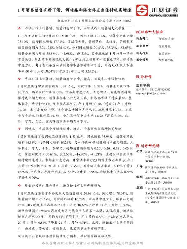 【川财证券】【20210206】食品饮料行业1月线上数据分析专题:1月酒类销售有所下滑,调味品和膳食补充剂保持较高增速-19页
