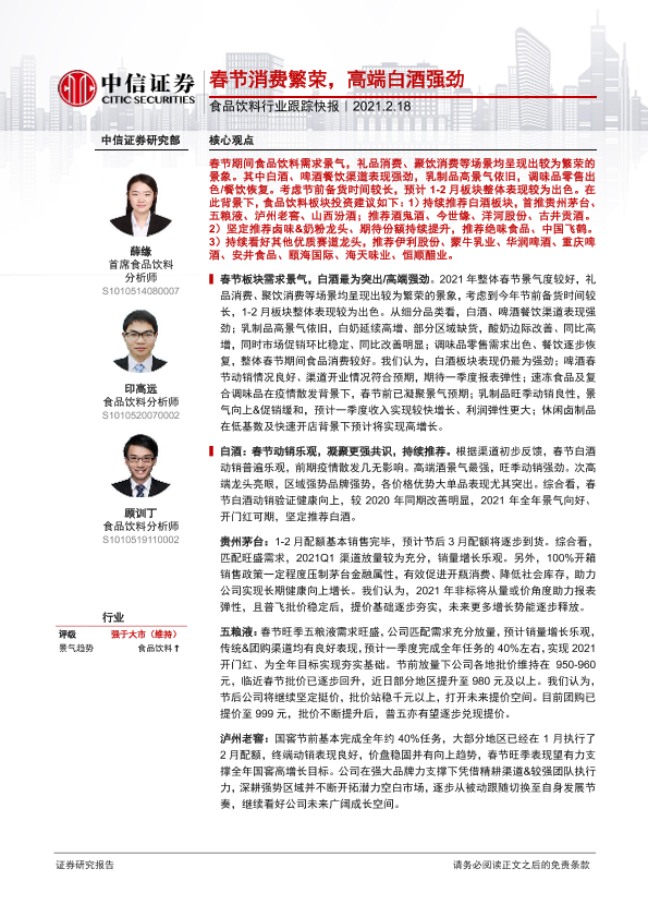 【中信证券】【20210218】20210218-中信证券-食品饮料行业跟踪快报:春节消费繁荣,高端白酒强劲-3页