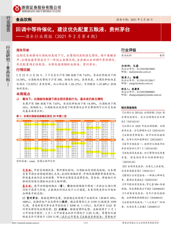 【浙商证券】【20210228】酒水行业周报(2021年2月第4期):回调中等待催化,建议优先配置五粮液、贵州茅台-15页