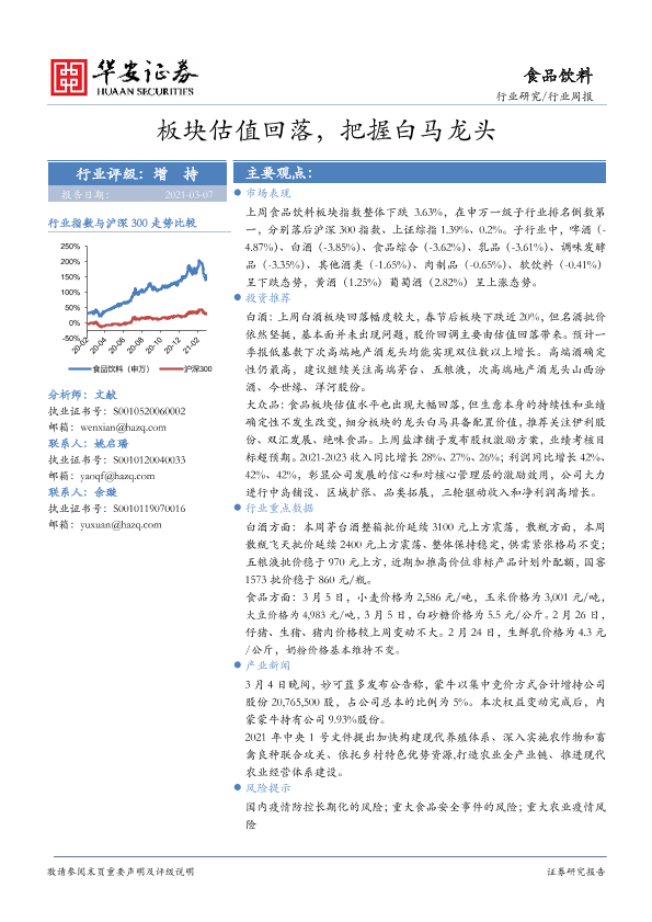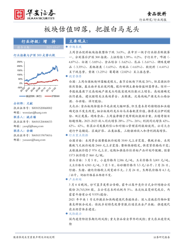 【华安证券】【20210307】20210307-华安证券-食品饮料行业周报:板块估值回落,把握白马龙头-19页