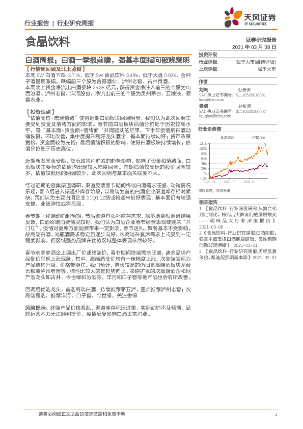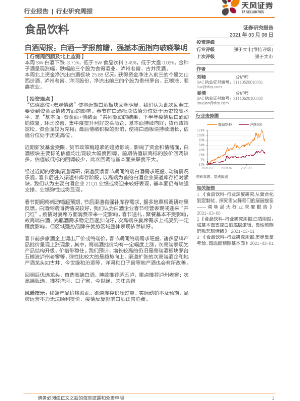 【天风证券】【20210308】20210308-天风证券-食品饮料-白酒周报:白酒一季报前瞻,强基本面指向破晓黎明-7页