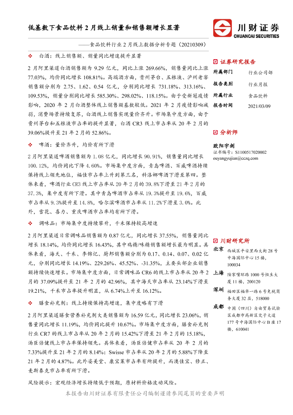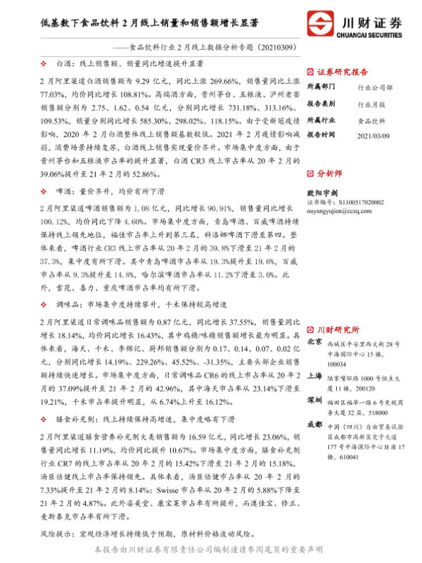 【川财证券】【20210309】食品饮料行业2月线上数据分析专题:低基数下食品饮料2月线上销量和销售额增长显著-18页