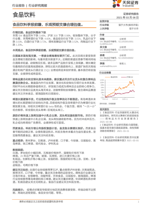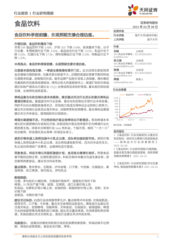 【天风证券】【20210308】食品饮料季报前瞻,乐观预期支撑合理估值-8页