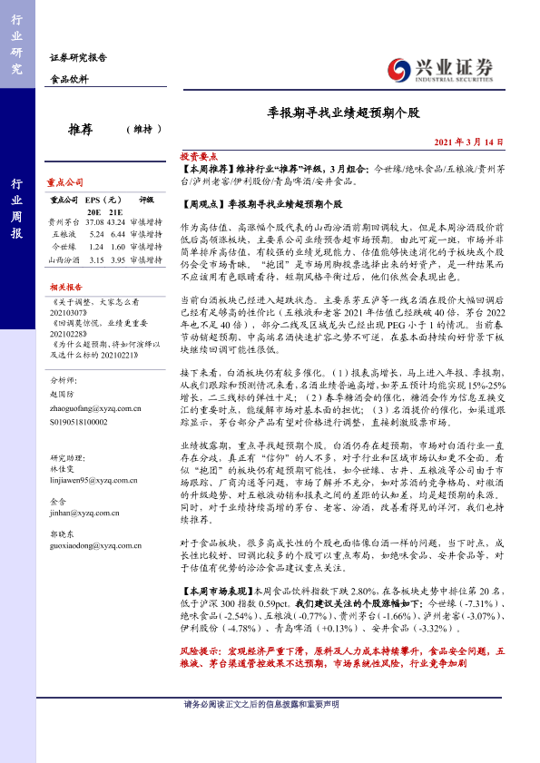 【兴业证券】【20210314】20210314-兴业证券-食品饮料行业周报:季报期寻找业绩超预期个股-16页