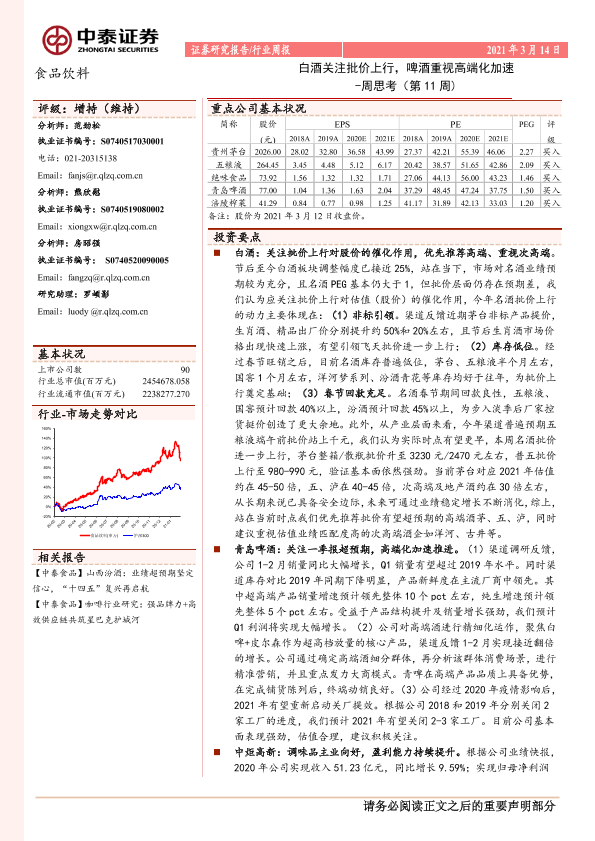 【中泰证券】【20210314】食品饮料周思考(第11周):白酒关注批价上行,啤酒重视高端化加速-8页