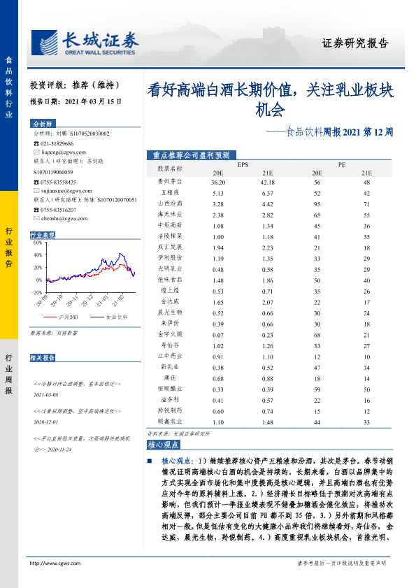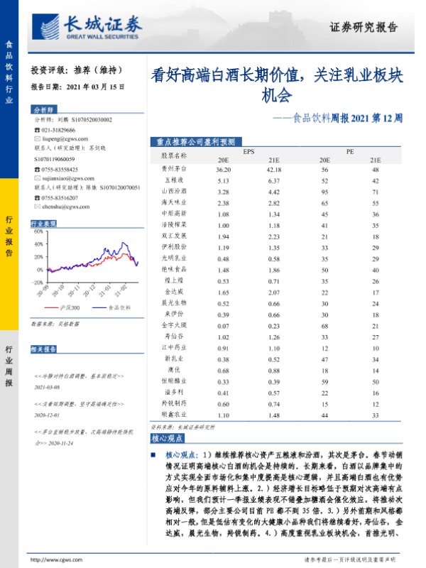 【长城证券】【20210315】食品饮料周报2021第12周:看好高端白酒长期价值,关注乳业板块机会-13页