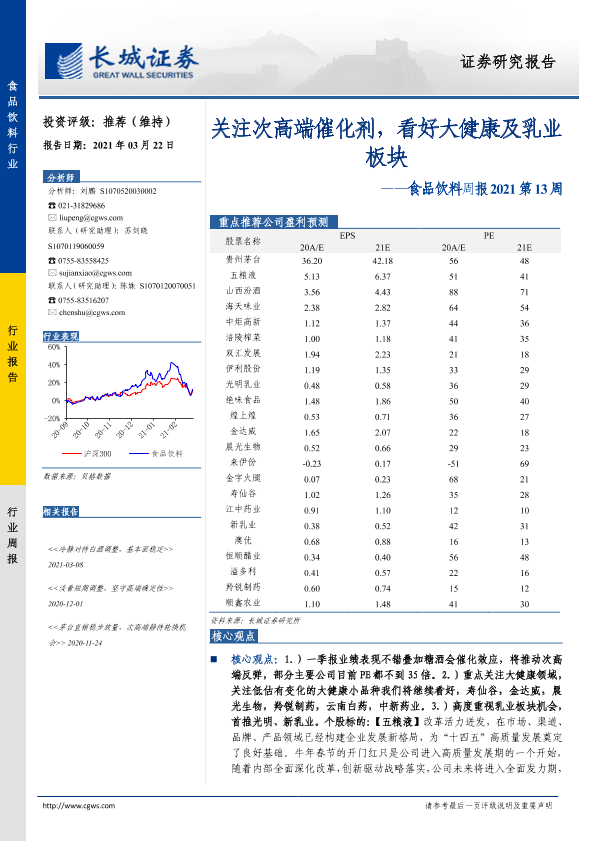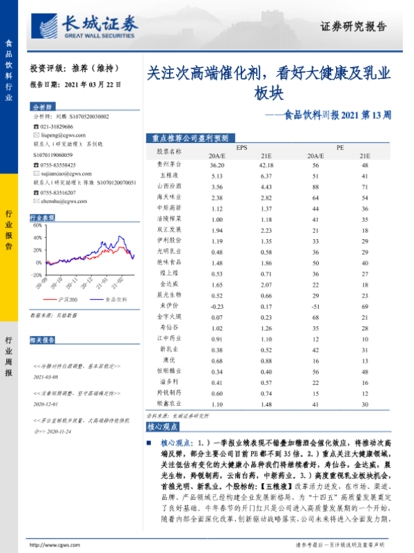 【长城证券】【20210322】食品饮料周报2021第13周:关注次高端催化剂,看好大健康及乳业板块-13页