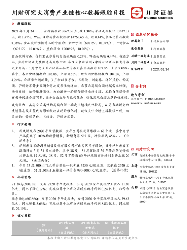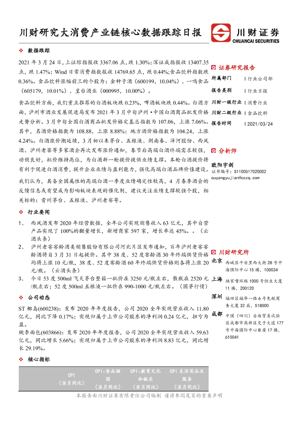 【川财证券】【20210324】食品饮料行业日报:川财研究大消费产业链核心数据跟踪日报-4页