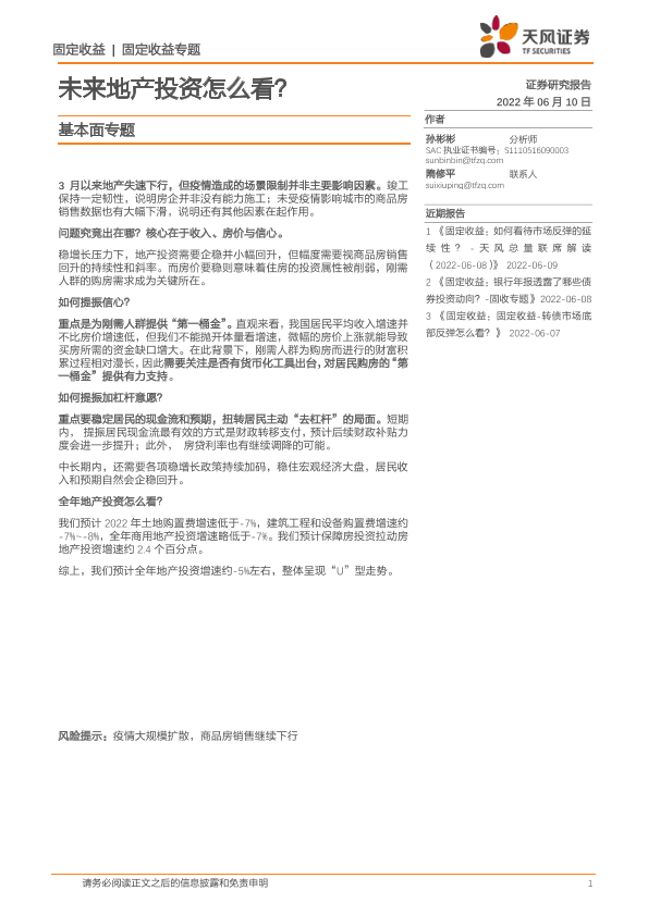 【天风证券】【20220610】固定收益专题:基本面专题,未来地产投资怎么看?-15页