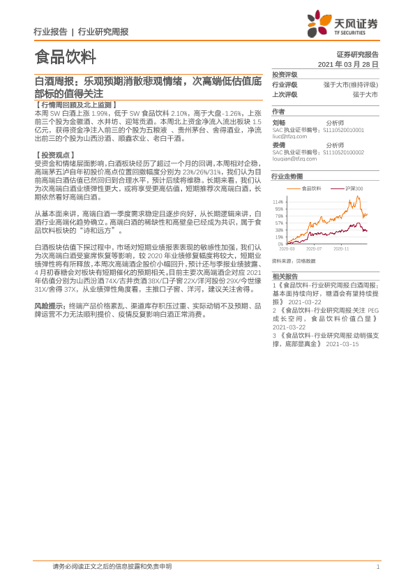 【天风证券】【20210328】食品饮料行业研究周报:白酒周报:乐观预期消散悲观情绪,次高端低估值底部标的值得关注-6页