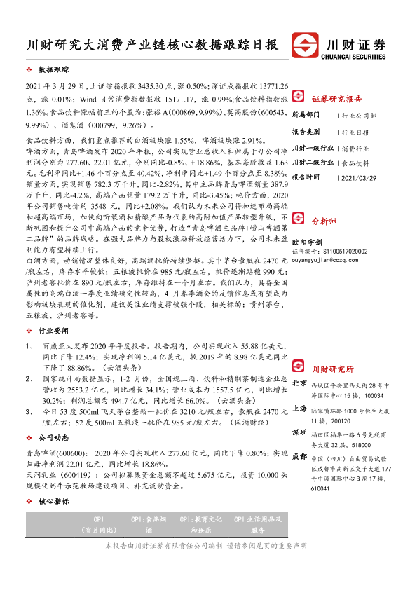【川财证券】【20210329】食品饮料行业日报:川财研究大消费产业链核心数据跟踪日报-4页
