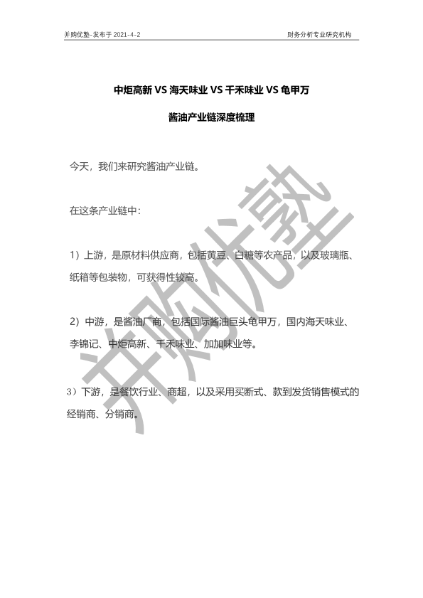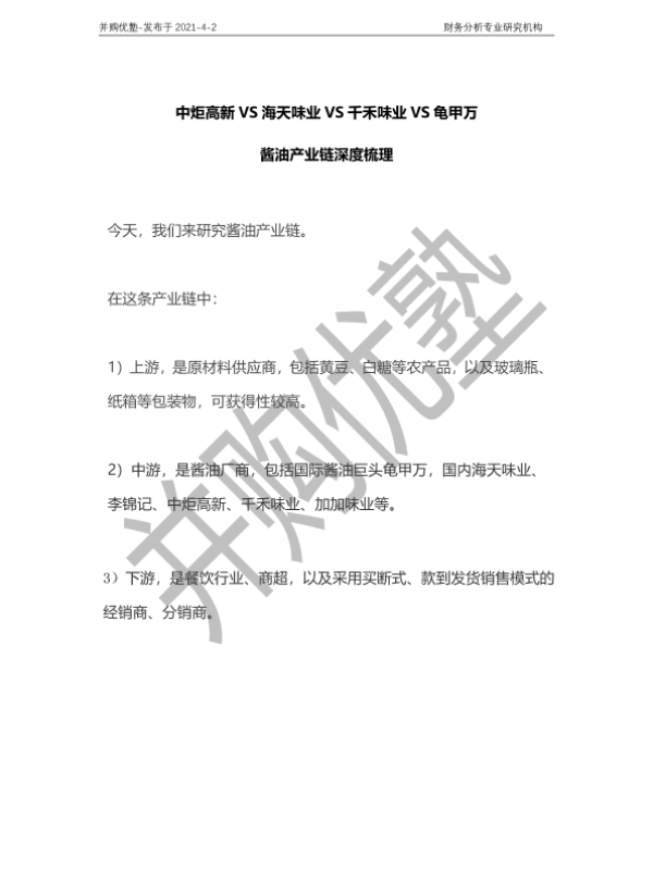 【并购优塾】【20210402】中炬高新VS海天味业VS千禾味业VS龟甲万:酱油产业链深度梳理-15页