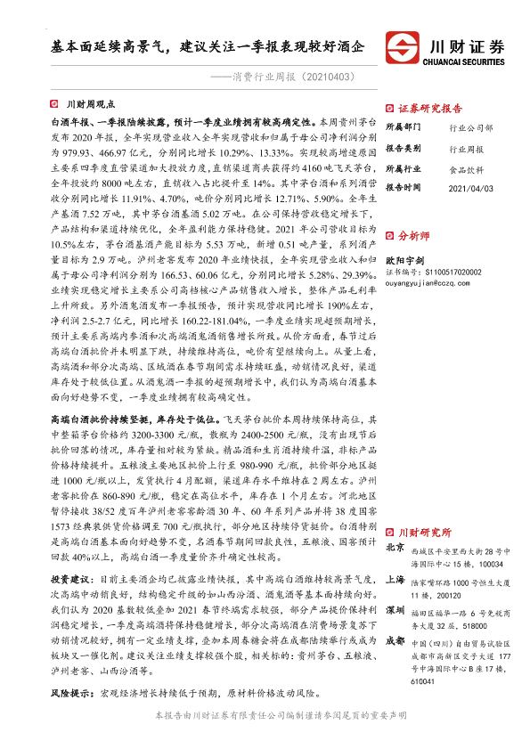 【川财证券】【20210403】消费行业周报:基本面延续高景气,建议关注一季报表现较好酒企-12页