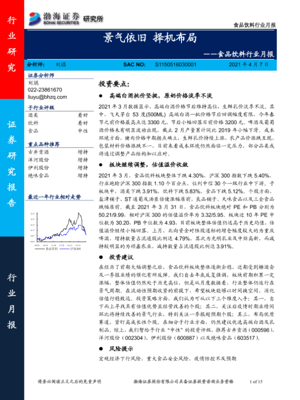 【渤海证券】【20210407】20210407-渤海证券-食品饮料行业月报:景气依旧 择机布局-15页