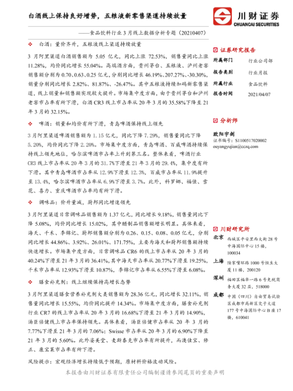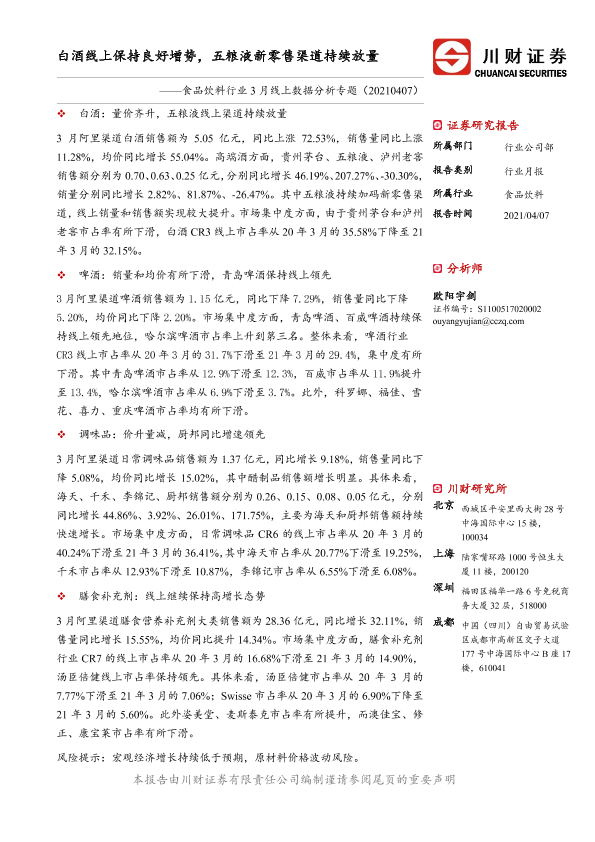 【川财证券】【20210407】食品饮料行业3月线上数据分析专题:白酒线上保持良好增势,五粮液新零售渠道持续放量-18页